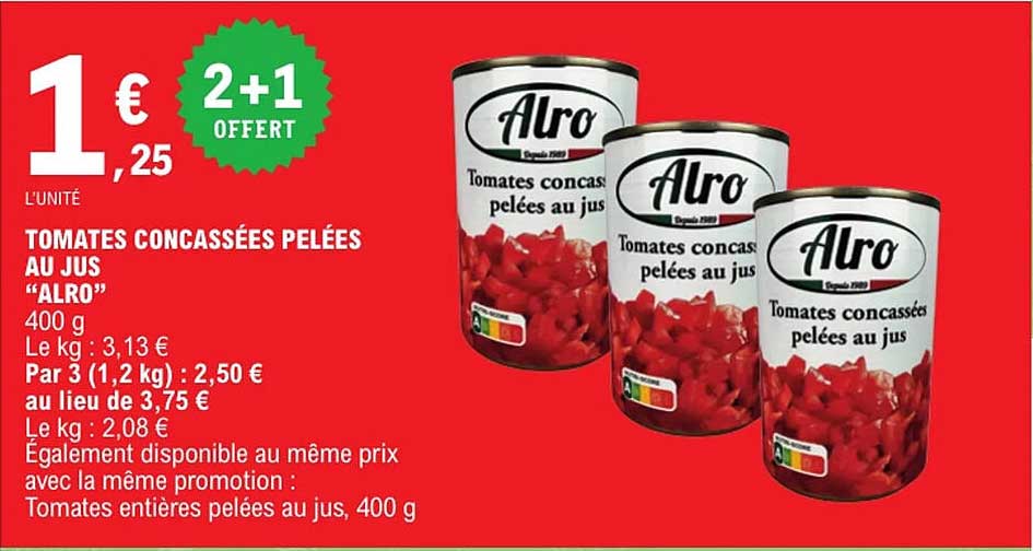 Offre de Tomates Concassees Pelees Au Jus "Alro" chez E.Leclerc