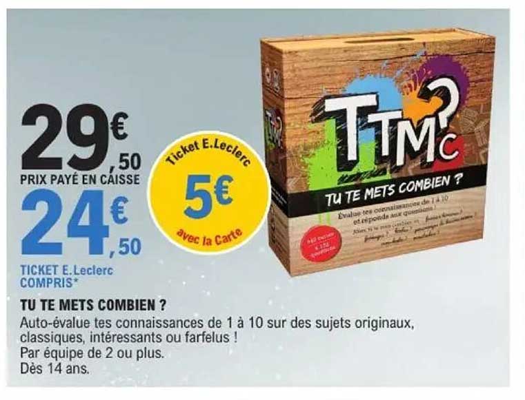 Découvrez l'offre de Tu Te Mets Combien ? chez E.Leclerc! Cette offre fantastique est maintenant disponible dans le nouveau catalogue de E.Leclerc. Profitez de cette occasion et économisez considérablement sur votre achat.
