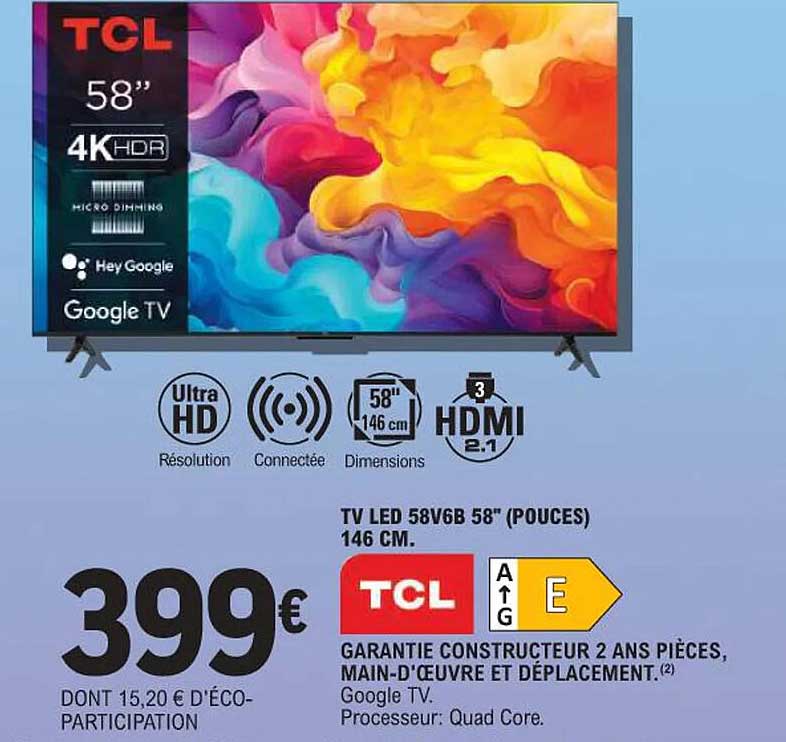 Découvrez cette incroyable offre sur la TV LED 58V6B de la marque TCL, disponible chez E.Leclerc. Valable du 1er au 12 avril 2025, cette télévision de 58 pouces est l’idéal pour transformer votre salon en salle de cinéma. Avec sa résolution Ultra HD et sa technologie 4K HDR, profitez d'images éclatantes et d'une qualité d'image exceptionnelle.