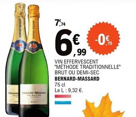 Découvrez dès maintenant la offre VIN EFFERVESCENT "MÉTHODE TRADITIONNELLE" BRUT OU DEMI-SEC BERNARD-MASSARD dans le catalogue de E.Leclerc. Cette offre est valable du 24/09/2024 au 12/10/2024.