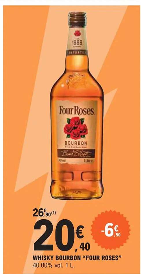 Découvrez l'offre de Whisky Bourbon "Four Roses" chez E.Leclerc! Cette offre fantastique est maintenant disponible dans le nouveau catalogue de E.Leclerc. Profitez de cette occasion et économisez considérablement sur votre achat.