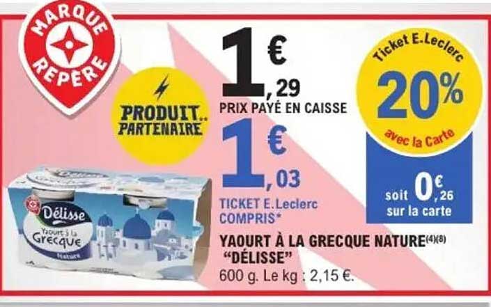 Découvrez l'offre de Yaourt À La Grecque Nature "Délisse" chez E.Leclerc! Cette offre fantastique est maintenant disponible dans le nouveau catalogue de E.Leclerc. Profitez de cette occasion et économisez considérablement sur votre achat.