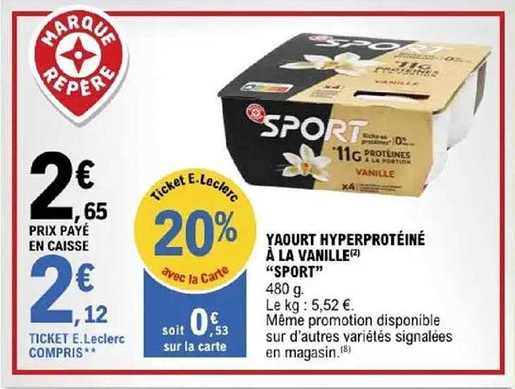 Découvrez dès maintenant la offre YAOURT HYPERPROTÉINÉ À LA VANILLE "SPORT" dans le catalogue de E.Leclerc. Cette offre est valable du 08/04/2025 au 19/04/2025.
