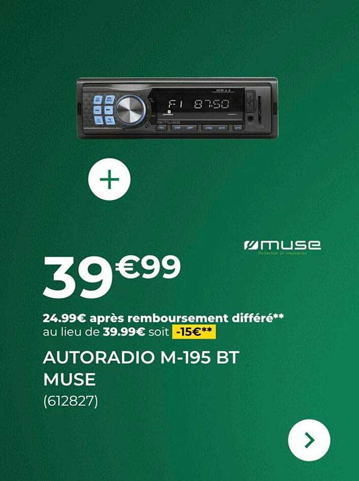 Profitez de l’Autoradio M-195 BT à seulement 39,99 € ! Avec un remboursement différé, son prix après remboursement tombe à 24,99 €, offrant une réduction de 15 €. C'est une opportunité à ne pas rater pour améliorer votre expérience de conduite.