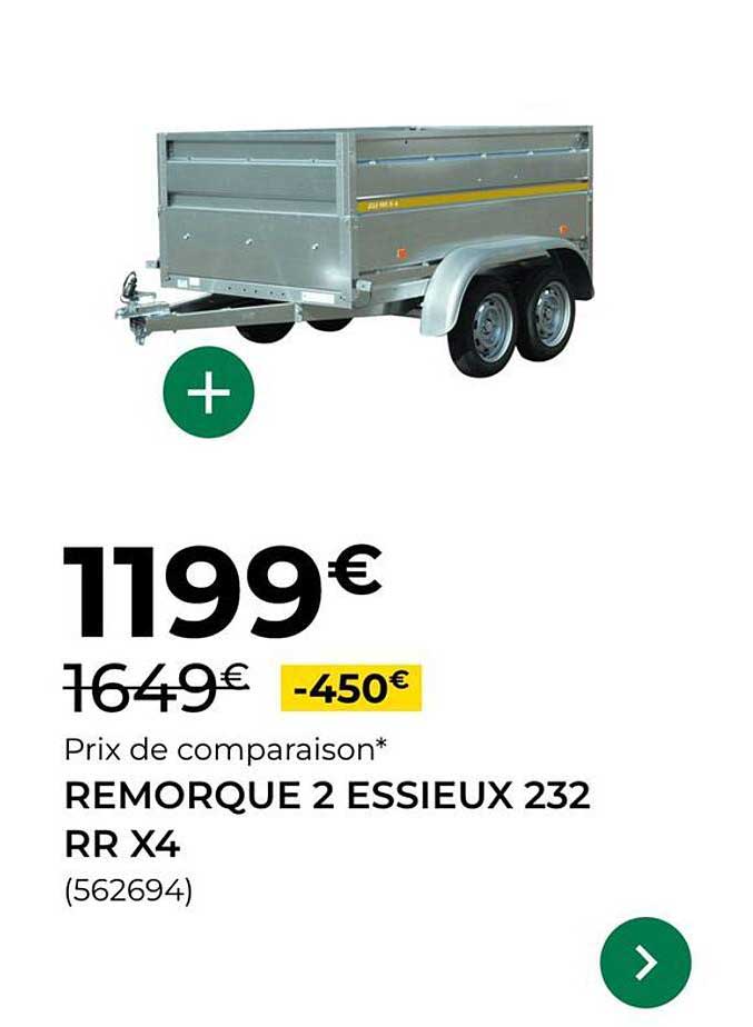 Découvrez une opportunité exceptionnelle avec la remorque 2 essieux 232 RR X4, idéale pour tous vos besoins de transport. Que ce soit pour vos projets de bricolage, vos déplacements en camping, ou pour transporter des matériaux, cette remorque s'avère être un choix judicieux. Actuellement en promotion, elle est proposée à un prix attractif qui ne manquera pas de vous séduire.