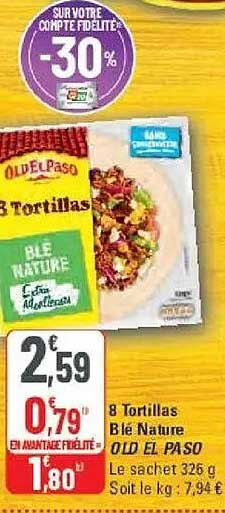 Découvrez les 8 Tortillas Blé Nature de la marque OLD EL PASO, un incontournable pour vos soirées tacos ou vos plats mexicains. Profitez d'une réduction exceptionnelle sur ce produit savoureux, idéal pour les amateurs de cuisine authentique. C'est le moment parfait pour faire le plein de tortillas savoureuses et ajouter une touche d'exotisme à vos repas en famille ou entre amis.