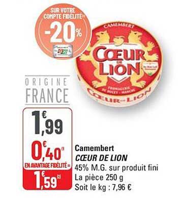 Découvrez la superbe offre de Camembert Coeur De Lion dans le nouveau catalogue de G20. En plus de cette offre, vous trouverez de nombreuses autres réductions attrayantes. Vous pouvez facilement commander le Camembert Coeur De Lion en ligne via le site web de G20 ou l'acheter dans un magasin près de chez vous.