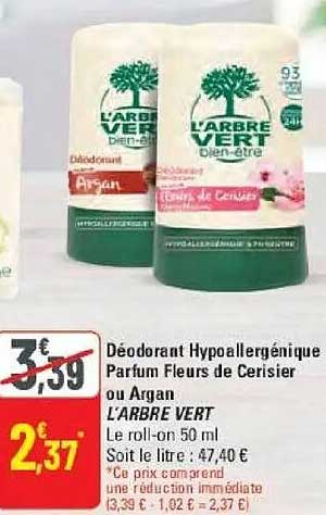 Découvrez l'offre exceptionnelle sur le déodorant hypoallergénique L'ARBRE VERT, disponible en parfums Fleurs de Cerisier ou Argan. Parfait pour ceux qui cherchent à allier bien-être et efficacité, ce déodorant promet une protection optimale tout en respectant votre peau, même les plus sensibles. Profitez de cette réduction du 5 au 16 novembre 2025 et offrez à votre peau un vrai moment de douceur.
