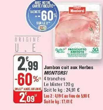 Découvrez une promotion irrésistible sur le jambon cuit aux herbes MONTORSI, une offre que vous ne voudrez pas manquer! Ce produit savoureux, idéal pour vos sandwiches ou vos plateaux de charcuterie, est disponible à un prix exceptionnel. Profitez de cette délicieuse option pour rehausser vos plats avec une touche d'originalité.