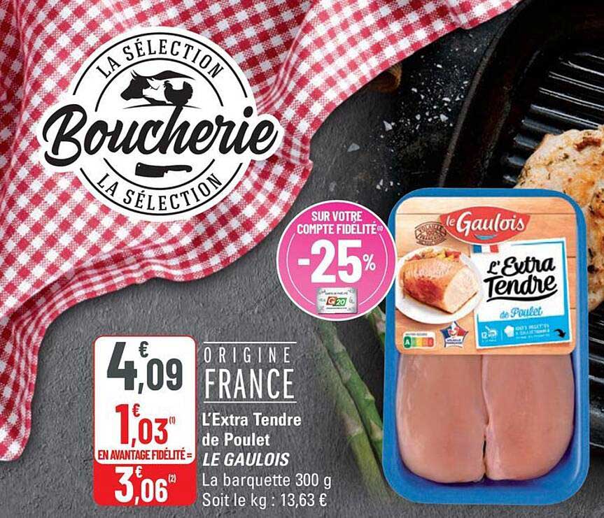 Découvrez dès maintenant la offre L'Extra Tendre de Poulet LE GAULOIS dans le catalogue de G20. Cette offre est valable du 15/01/2025 au 26/01/2025.