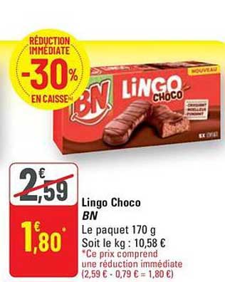 Découvrez le Lingo Choco, une délicieuse gourmandise qui ravira les petits comme les grands ! Ce produit, présenté sous forme de biscuits enrobés de chocolat, est parfait pour accompagner vos pauses café ou pour satisfaire une petite envie sucrée. Avec une offre exceptionnelle à -30% en caisse, c'est le moment idéal pour faire le plein de friandises sans culpabilité.