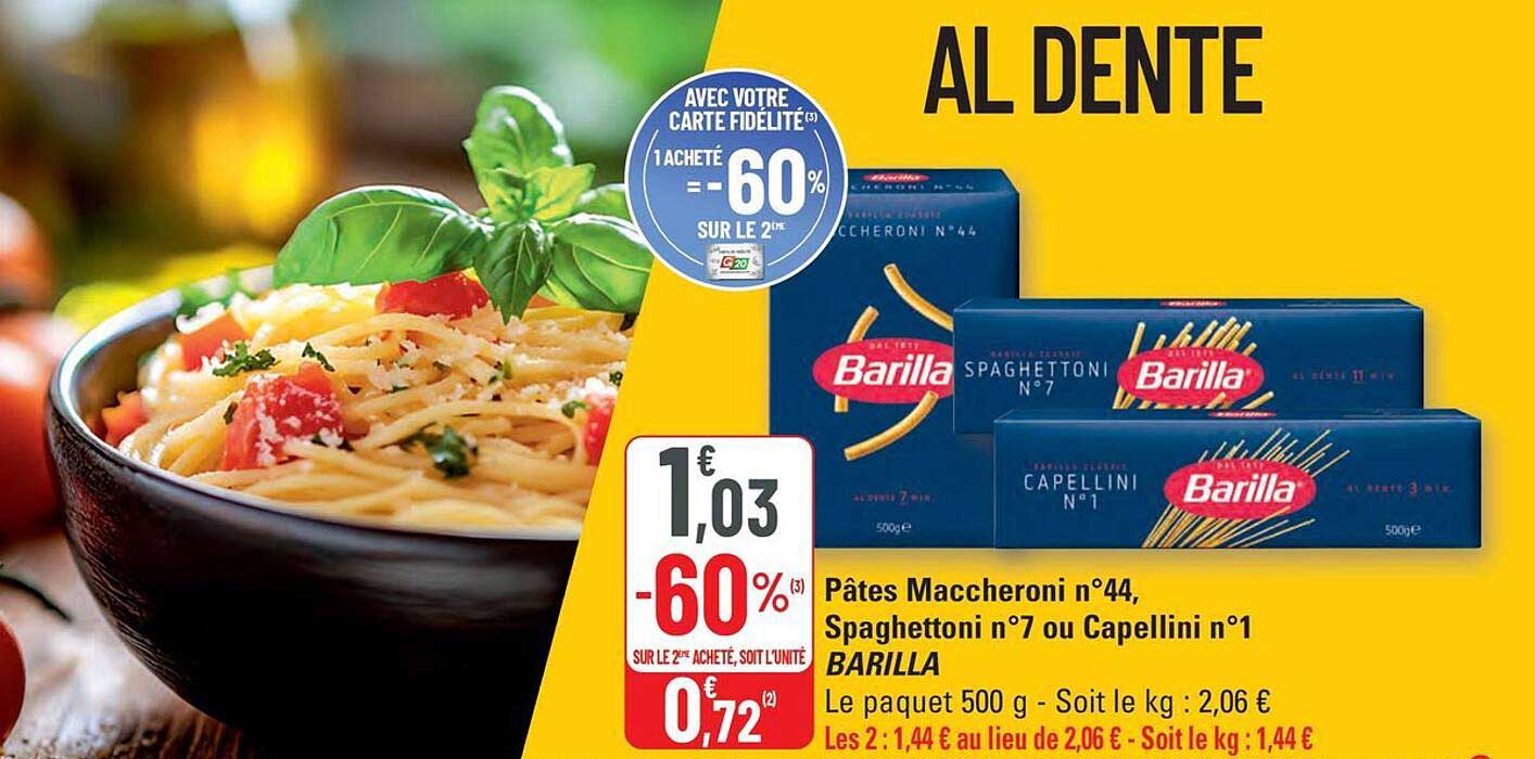 Découvrez l'offre de Pâtes Maccheroni N°44, Spaghettoni N°7 Ou Capellini N°1 Barilla chez G20! Cette offre fantastique est maintenant disponible dans le nouveau catalogue de G20. Profitez de cette occasion et économisez considérablement sur votre achat.