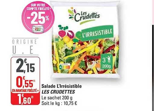 Découvrez la Salade L'Irresistible de Les Crudettes, une option fraîche et savoureuse pour vos repas quotidiens. Elle est parfaite pour accompagner vos plats, pour vos déjeuners légers ou même pour agrémenter vos recettes de cuisine. Avec une offre à -25%, c'est l'occasion rêvée de faire le plein de vitamines sans se ruiner.