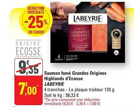 Découvrez notre promotion exceptionnelle sur le Saumon fumé Grandes Origines Highlands d’Ecosse LABEYRIE. Profitez de cette réduction de 25% pendant une période limitée, parfaite pour enrichir vos repas avec un produit de qualité. Que ce soit pour un apéritif, un repas élégant ou pour rehausser vos plats quotidiens, cette offre est à ne pas manquer !