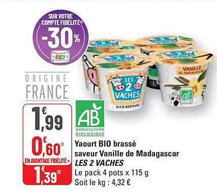 Offre de Yaourt Bio Brassé Saveur Vanille De Madagascar Les 2 Vaches chez G20