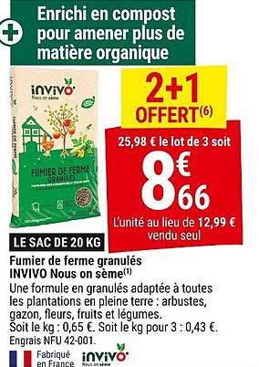 Découvrez notre incroyable promotion sur le fumier de ferme granulés de la marque INVIVO, proposé par Gamm vert ! Vous pouvez bénéficier d'une offre 2+1, ce qui signifie que pour l'achat de deux sacs de 20 kg, le troisième est offert ! C'est une excellente occasion de nourrir vos plantes et d'améliorer la qualité de votre sol avec un produit riche en compost, parfait pour toutes vos plantations en pleine terre.