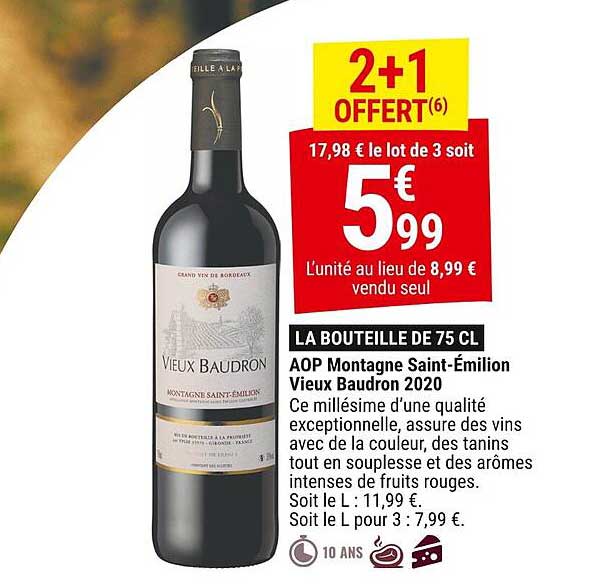Découvrez une offre irrésistible sur le vin AOP Montagne Saint-Émilion Vieux Baudron 2020 ! Ce millésime de qualité exceptionnelle, reconnu pour sa finesse, vous attend à un prix imbattable. Grâce à cette promotion, vous pouvez savourer un excellent vin sans vous ruiner. Une occasion à ne pas manquer pour enrichir votre cave ou pour offrir en cadeau !