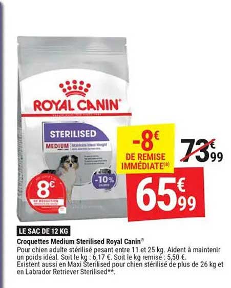 Découvrez la superbe offre de Croquettes Medium Sterilised Royal Canin® dans le nouveau catalogue de Gamm vert. En plus de cette offre, vous trouverez de nombreuses autres réductions attrayantes. Vous pouvez facilement commander le Croquettes Medium Sterilised Royal Canin® en ligne via le site web de Gamm vert ou l'acheter dans un magasin près de chez vous.