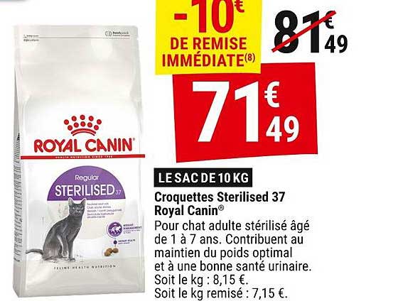 Découvrez la superbe offre de Croquettes Sterilised 37 Royal Canin® dans le nouveau catalogue de Gamm vert. En plus de cette offre, vous trouverez de nombreuses autres réductions attrayantes. Vous pouvez facilement commander le Croquettes Sterilised 37 Royal Canin® en ligne via le site web de Gamm vert ou l'acheter dans un magasin près de chez vous.