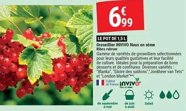 Vous voulez être informé immédiatement dès que le Groseillier Invivo Nous On Sème Ribes Rubrum est en promotion? Inscrivez-vous à notre alerte d'offres. Vous recevrez une notification dès que le produit sera disponible à un prix avantageux.
