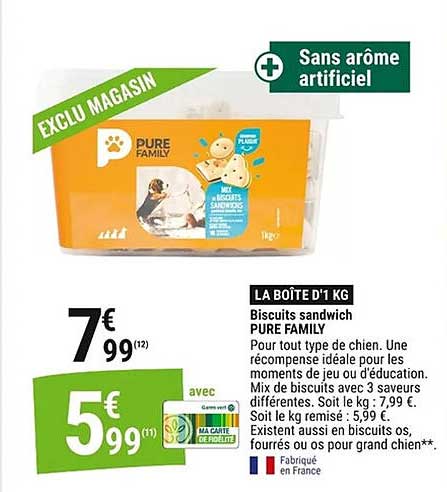 Découvrez une délicieuse récompense pour votre fidèle compagnon avec la boîte de biscuits sandwich PURE FAMILY ! Conçus pour tous types de chiens, ces biscuits sont parfaits pour les moments de jeu et d'éducation. Offrez à votre animal une collation gourmande et saine, sans arômes artificiels.