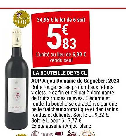 Découvrez une offre irrésistible sur le vin AOP Anjou Domaine de Gagnebert 2023, idéal pour accompagner vos repas et vos moments de convivialité. Avec une robe rouge cerise profonde aux reflets violets, ce vin se démarque par son nez fin et délicat, dominé par des arômes de fruits rouges. Proposé à un prix exceptionnel, cette promotion est une opportunité à ne pas manquer.