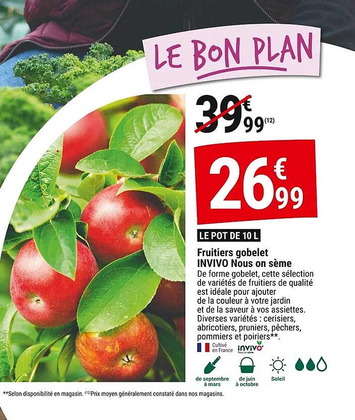 Découvrez une offre exceptionnelle sur les fruitiers gobelet INVIVO, parfaits pour embellir votre jardin tout en savourant de délicieux fruits ! Cette sélection de variétés de qualité vous permet d'ajouter des touches de couleur et de saveur à votre espace extérieur. Que vous soyez un passionné de jardinage ou simplement à la recherche d'une belle plante fruitière, cette promotion est faite pour vous.
