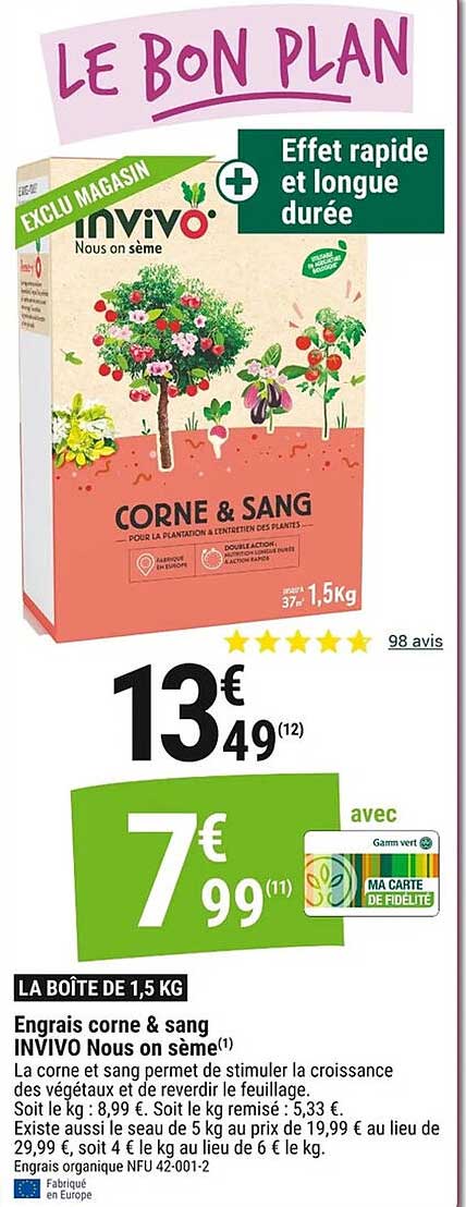 Découvrez notre offre exclusive sur l'engrais corne et sang INVIVO, parfait pour la plantation et l'entretien de vos plantes. Grâce à sa formule efficace, cet engrais garantit un effet rapide et durable, idéal pour les jardiniers et amateurs de jardinage. Pourquoi ne pas booster la croissance de vos végétaux tout en économisant ? C'est le moment de faire le plein de bonnes affaires!