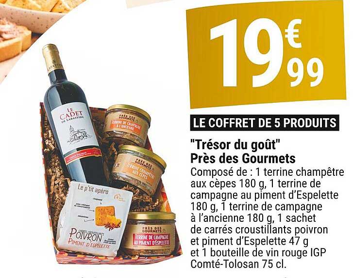 Découvrez le 'Trésor du goût', un coffret exceptionnel pour les amateurs de gastronomie française. Ce coffret se distingue par sa sélection raffinée de produits locaux, alliant saveurs et tradition. Parfait pour offrir ou pour se faire plaisir pendant les fêtes, ce coffret est une belle occasion de découvrir des délices soigneusement choisis.