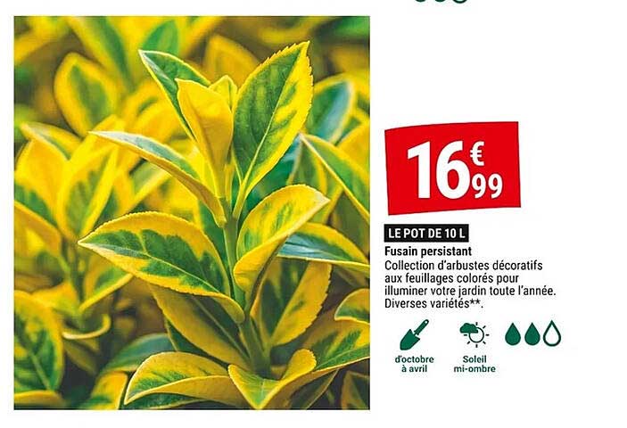 Décorez votre jardin avec le fusain persistant, un arbuste remarquable aux feuillages colorés qui illuminera vos espaces extérieurs tout au long de l'année. Cette offre spéciale, valable jusqu'au 19 octobre 2025, vous permet de profiter d'un produit de qualité à un prix attractif.