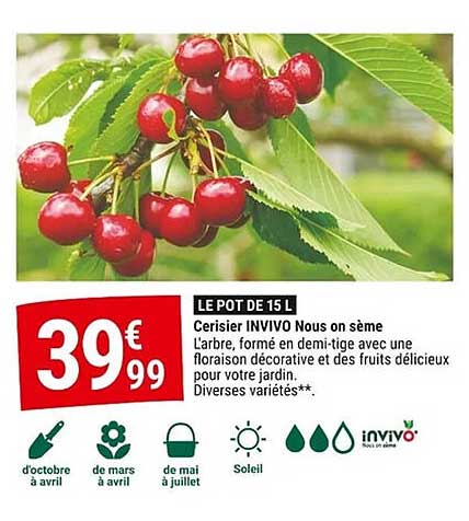 Découvrez une offre irrésistible sur le cerisier INVIVO ! Parfait pour apporter une touche décorative à votre jardin tout en vous offrant de délicieux fruits. Avec cette promotion, c'est le moment idéal pour embellir votre espace extérieur ! Profitez de cette offre du 8 au 19 octobre 2025 et transformez votre jardin en un véritable havre de paix.