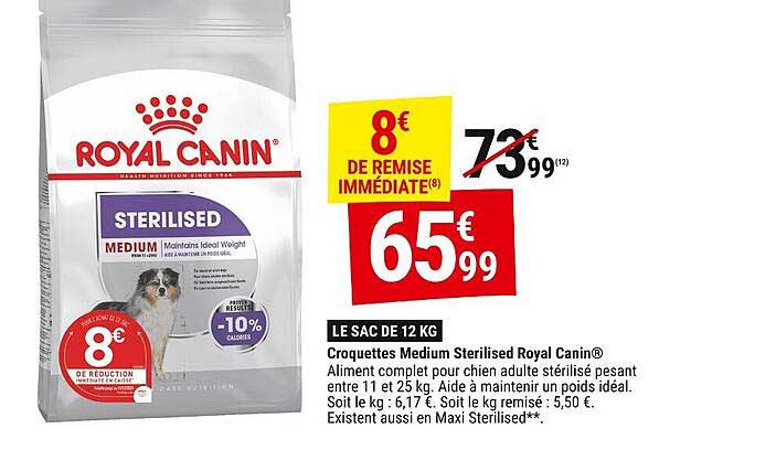 Découvrez les croquettes Medium Sterilised Royal Canin®, spécialement conçues pour les chiens adultes stérilisés pesant entre 11 et 25 kg. Cette offre incroyable vous permet de bénéficier d'une remise immédiate de 8€, rendant l'aliment non seulement de qualité, mais aussi accessible. Grâce à sa composition, cet aliment aide à maintenir un poids idéal, idéal pour votre compagnon à quatre pattes.