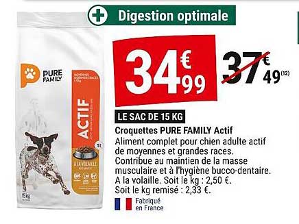 Découvrez l'offre exceptionnelle sur les croquettes PUR FAMILY Actif, spécialement conçues pour les chiens adultes actifs de moyennes et grandes races. Ces croquettes sont non seulement délicieuses, mais également formulées pour contribuer au maintien de la masse musculaire et à l'hygiène bucco-dentaire de votre compagnon à quatre pattes.