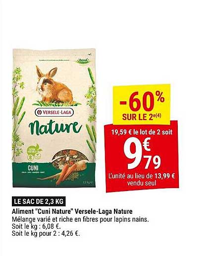 Découvrez cette offre incroyable sur l'aliment "Cuni Nature" de Versele-Laga. Ce mélange varié et riche en fibres est spécialement conçu pour vos lapins nains. L'occasion parfaite de leur offrir une alimentation saine et équilibrée à un prix exceptionnel.