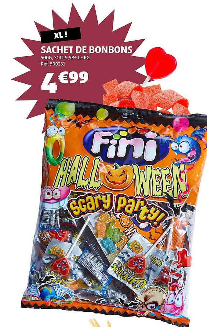 Le sachet de bonbons Fini pour Halloween est la douceur parfaite pour égayer vos fêtes ! Avec 500g de sucreries délicieuses, cette offre vous permet de faire plaisir à vos amis et à votre famille tout en vous régalant. C'est une excellente opportunité d'ajouter une touche sucrée à vos célébrations, surtout pendant la saison d'Halloween.