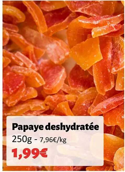 Découvrez la délicieuse papaye déshydratée, un en-cas naturel et savoureux qui ravira vos papilles ! Disponible à un prix exceptionnel, cette offre est une véritable occasion à ne pas manquer. Profitez de fruits déshydratés qui préservent toutes leurs saveurs tout en étant faciles à emporter.
