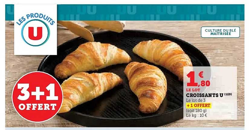 Découvrez une promotion irrésistible sur les croissants U qui mettra vos papilles en émoi ! Profitez de l'offre spéciale : achetez un lot de trois croissants et recevez un croissant supplémentaire gratuitement. Une occasion parfaite pour se régaler au petit-déjeuner ou pour une pause gourmande à tout moment de la journée.