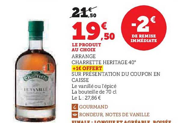 Découvrez l'ARRANGE CHARRETTE HERITAGE 40°, une boisson authentique qui séduira les amateurs de saveurs raffinées. Actuellement en promotion chez Hyper U, cette bouteille de 70 cl vous est proposée à un prix exceptionnel de 19,50€, au lieu de 21,50€. Une belle occasion de savourer un mélange unique aux notes de vanille, tout en économisant !