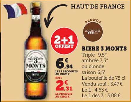 Découvrez la superbe offre de Bière 3 Monts dans le nouveau catalogue de Hyper U. En plus de cette offre, vous trouverez de nombreuses autres réductions attrayantes. Vous pouvez facilement commander le Bière 3 Monts en ligne via le site web de Hyper U ou l'acheter dans un magasin près de chez vous.