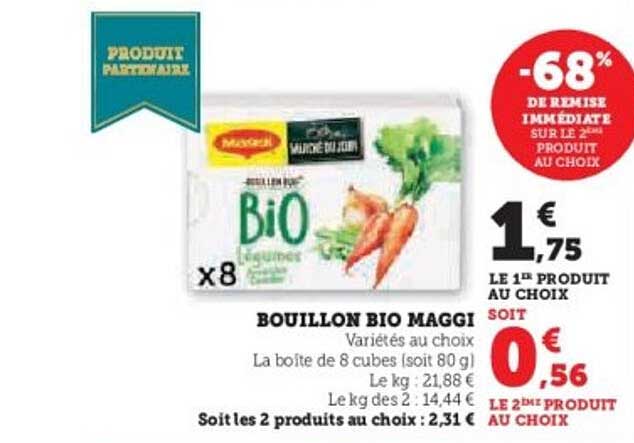 Découvrez le Bouillon Bio Maggi, une excellente option pour enrichir vos plats de façon saine et savoureuse. Actuellement en promotion chez Hyper U, cette offre vous permet de profiter d'une réduction significative sur votre premier produit choisi. Que vous soyez un adepte de la cuisine bio ou simplement à la recherche d'une alternative plus naturelle, ce bouillon saura répondre à vos attentes.