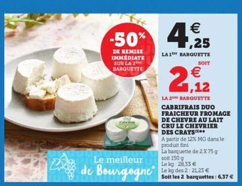 Si vous recherchez un fromage de chèvre à la fois crémeux et savoureux, ne manquez pas cette promotion exceptionnelle sur le Cabrifrais Duo fraîcheur. Avec une durée limitée allant du 9 janvier 2023 au 9 décembre 2023, c'est le moment idéal pour découvrir ou redécouvrir ce délice fromager. Que ce soit pour un apéritif entre amis ou pour agrémenter vos plats, ce fromage est un incontournable.