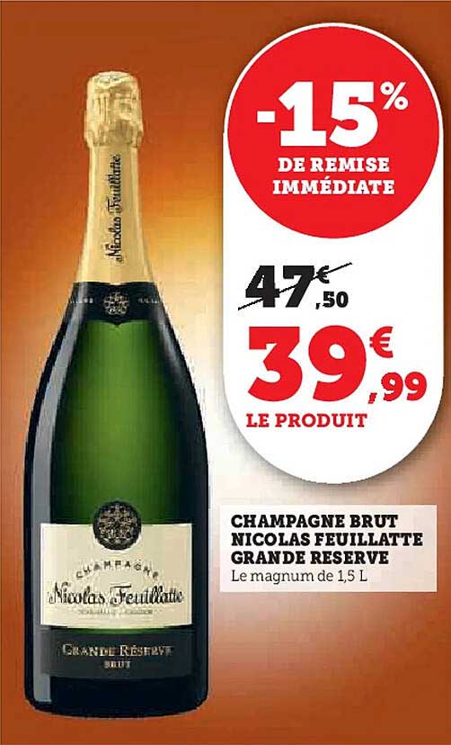 Découvrez la superbe offre de Champagne Brut Nicolas Feuillatte Grande Reserve dans le nouveau catalogue de Hyper U. En plus de cette offre, vous trouverez de nombreuses autres réductions attrayantes. Vous pouvez facilement commander le Champagne Brut Nicolas Feuillatte Grande Reserve en ligne via le site web de Hyper U ou l'acheter dans un magasin près de chez vous.