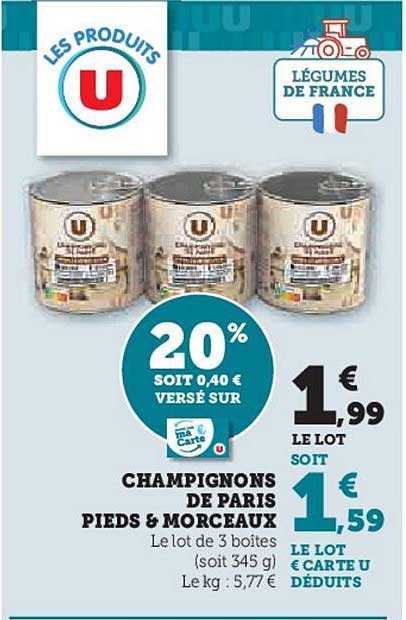 Découvrez l'offre de Champignons De Paris Pieds & Morceaux chez Hyper U! Cette offre fantastique est maintenant disponible dans le nouveau catalogue de Hyper U. Profitez de cette occasion et économisez considérablement sur votre achat.