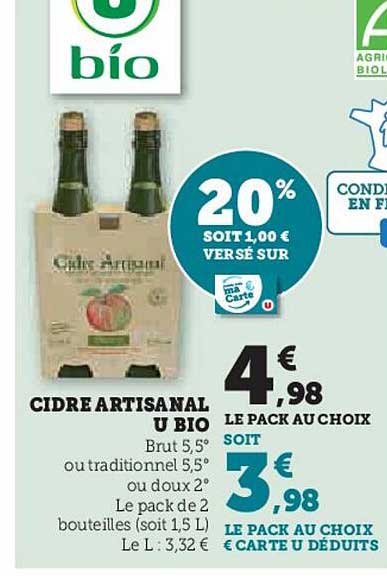 Découvrez la superbe offre de Cidre Artisanal U Bio dans le nouveau catalogue de Hyper U. En plus de cette offre, vous trouverez de nombreuses autres réductions attrayantes. Vous pouvez facilement commander le Cidre Artisanal U Bio en ligne via le site web de Hyper U ou l'acheter dans un magasin près de chez vous.