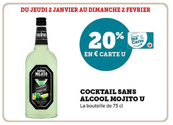 Découvrez dès maintenant la offre COCKTAIL SANS ALCOOL MOJITO U dans le catalogue de Hyper U. Cette offre est valable du 02/01/2025 au 02/02/2025.