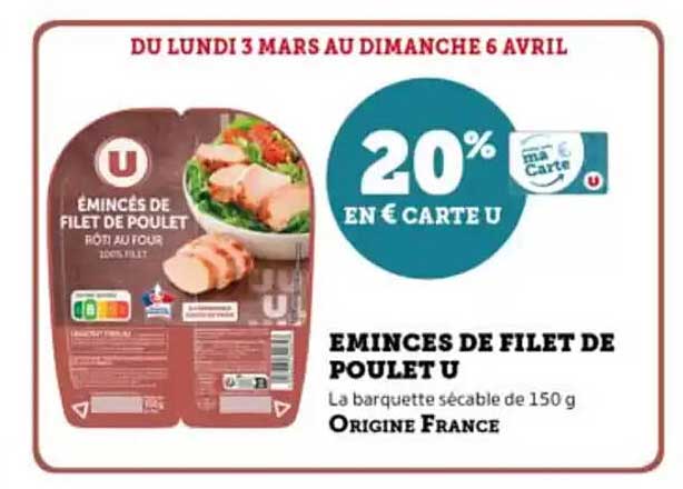 Découvrez l'offre de Émincés De Filet De Poulet U chez Hyper U! Cette offre fantastique est maintenant disponible dans le nouveau catalogue de Hyper U. Profitez de cette occasion et économisez considérablement sur votre achat.