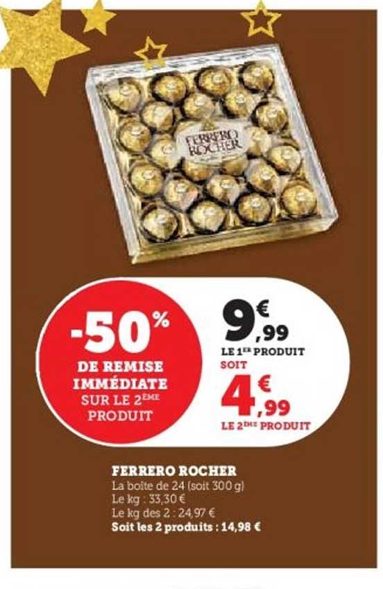 Cette promotion sur les célèbres Ferrero Rocher est une véritable aubaine pour les amateurs de douceurs. Avec une réduction de 50 % sur le deuxième produit, c'est l'occasion idéale de se faire plaisir tout en faisant des économies. Ne manquez pas de découvrir ces délicieuses douceurs qui séduisent à tous les coups, que ce soit pour offrir ou pour savourer lors d'une petite pause gourmande.
