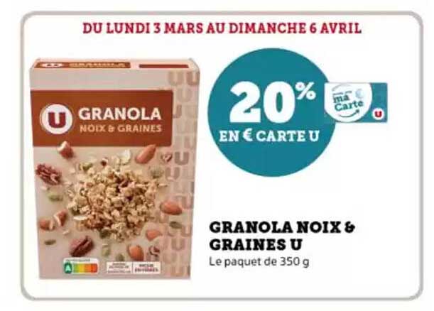 Découvrez dès maintenant la offre GRANOLA NOIX & GRAINES U dans le catalogue de Hyper U. Cette offre est valable du 03/03/2025 au 16/03/2025.