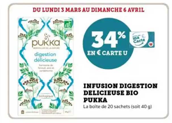 Découvrez dès maintenant la offre INFUSION DIGESTION DELICIEUSE BIO PUKKA dans le catalogue de Hyper U. Cette offre est valable du 03/03/2025 au 16/03/2025.