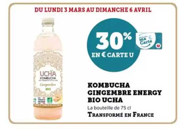Découvrez dès maintenant la offre KOMBUCHA GINGEMBRE ENERGY BIO UCHA dans le catalogue de Hyper U. Cette offre est valable du 03/03/2025 au 16/03/2025.